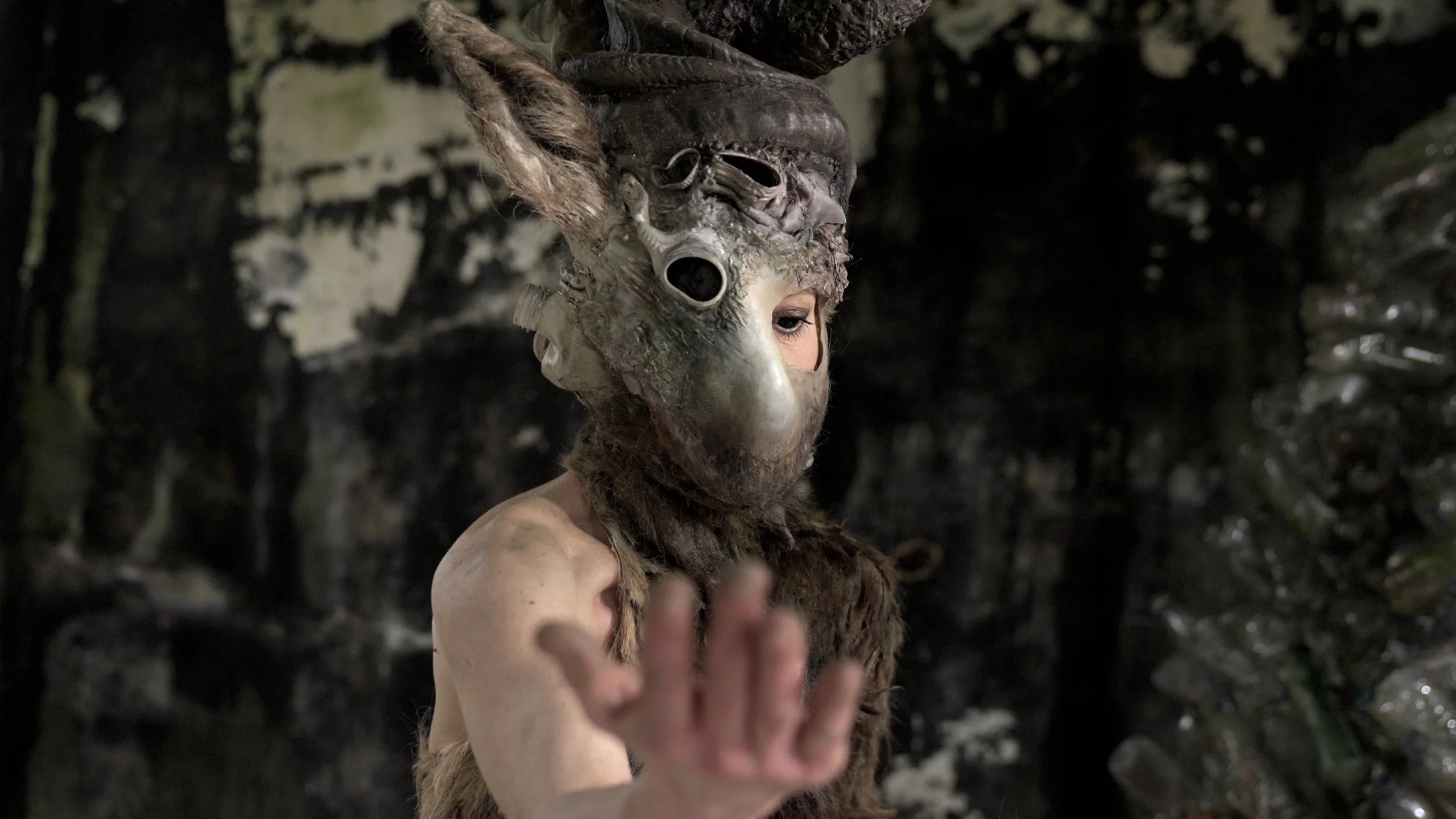 A hybrid character awakens to a state in which the human, animal, and material begin to merge.